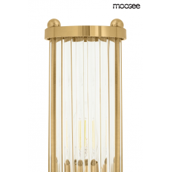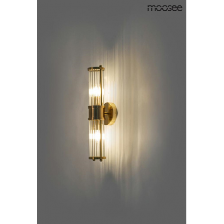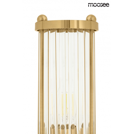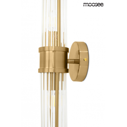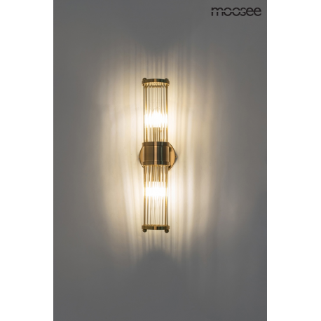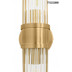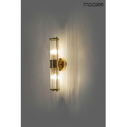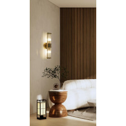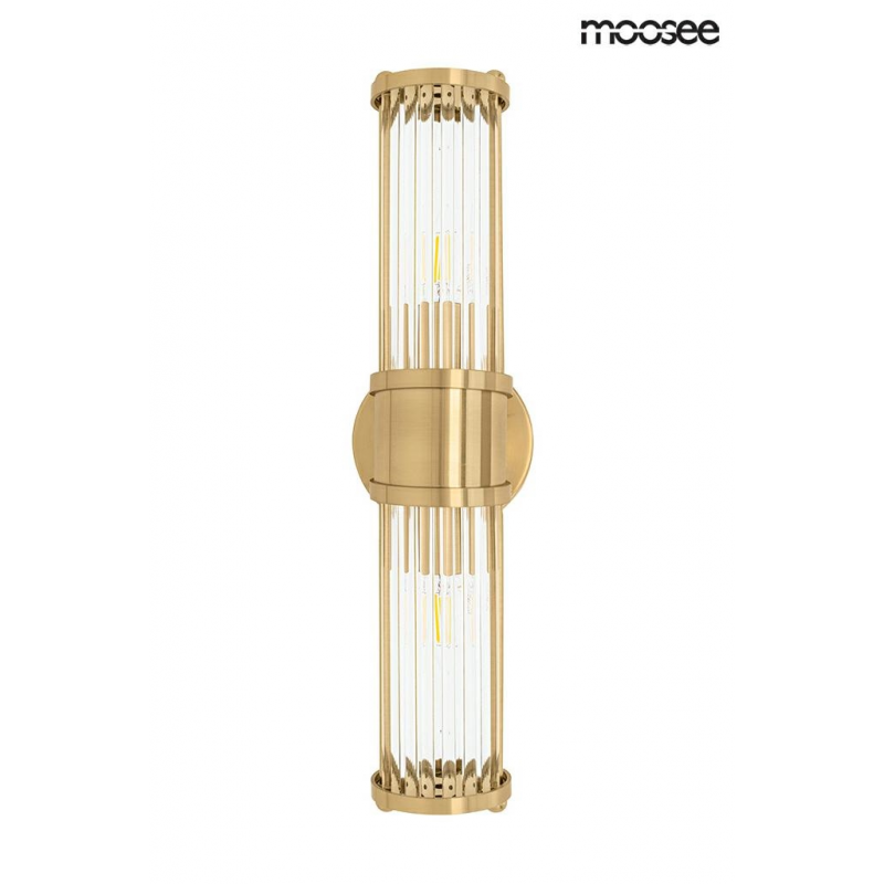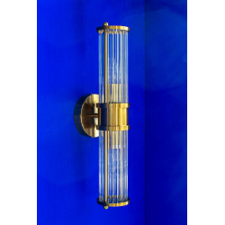 Lampa ścienna PILAR TWIN złota. Elegancka osłona kloszy wykonana została ze stali w kolorze złotym. Wewnątrz oprawy zamocowane są delikatne kryształowe klosze, w których źródło światła skierowane zo