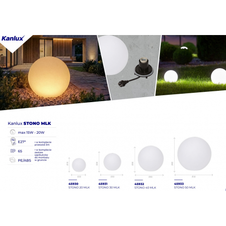 Kanlux STONO MLK to klasyczna wersja ogrodowych kul z mlecznym kloszem, która zapewnia miękkie, równomiernie rozproszone światło i subtelny efekt po zmroku. Świetlne kule o średnicach 20, 30, 40 i 50 cm harmonijnie wpisują się w przestrzeń ogrodu tworząc idealne tło do wieczornego relaksu. Każda oprawa wyposażona jest w kolce umożliwiające stabilne osadzenie w gruncie, a przystosowanie do wymiennego źródła światła pozwala dobrać odpowiednią moc do charakteru aranżacji. STONO MLK to ponadczasowe, dekoracyjne oświetlenie, które buduje przyjemny klimat wokół domu.