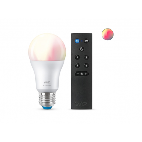 Standardowa, inteligentna żarówka kolorowa WiZ z trzonkiem E27 w zestawie z pilotem WiZmote. Za pomocą aplikacji WiZ lub przy użyciu poleceń głosowych możesz przyciemniać i rozjaśniać światło lub korzystać z zaprogramowanych trybów oświetlenia w konfiguracjach Wi-Fi.