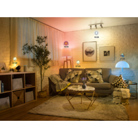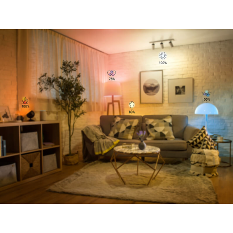 Teraz dzięki regulowanym kolorom i odcieniom bieli, eksperci WiZ zaprojektowali dynamiczne tryby oświetlenia, które całkowicie przyćmiewają wszelkie inne dostępne na rynku inteligentne produkty oświetleniowe. Podobnie jak wielkie utwory muzyczne, pomysłowo zsynchronizowane i dobrane, nasze tryby sprawiają, że każde pomieszczenie ma oszałamiającą atmosferę świetlną.